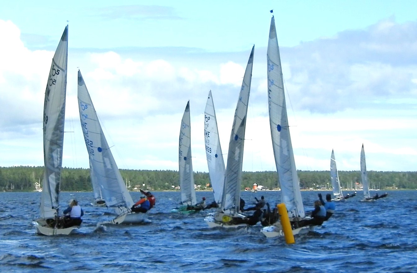 När nästan alla gått i mål dör vinden helt och därefter vrider den 180 grader. Banan läggs om och efter en god stund kommer vi iväg på dagens andra race som även det är utmanande och det gäller att fånga de tryck som finns. Peter och Martin gör det bra och blir 2:a efter bröderna Wester. Vi gör en rejäl uppsegling på sista undanvinden och lyckas ta oss i mål som 3:a. Ebbe och Olle har gjort två sämre seglingar och seglar inåt i den döende vinden. Banan ligger under ett rejält moln som verkar trycka bort vinden och den lilla vind som finns snurrar i alla möjliga riktningar.