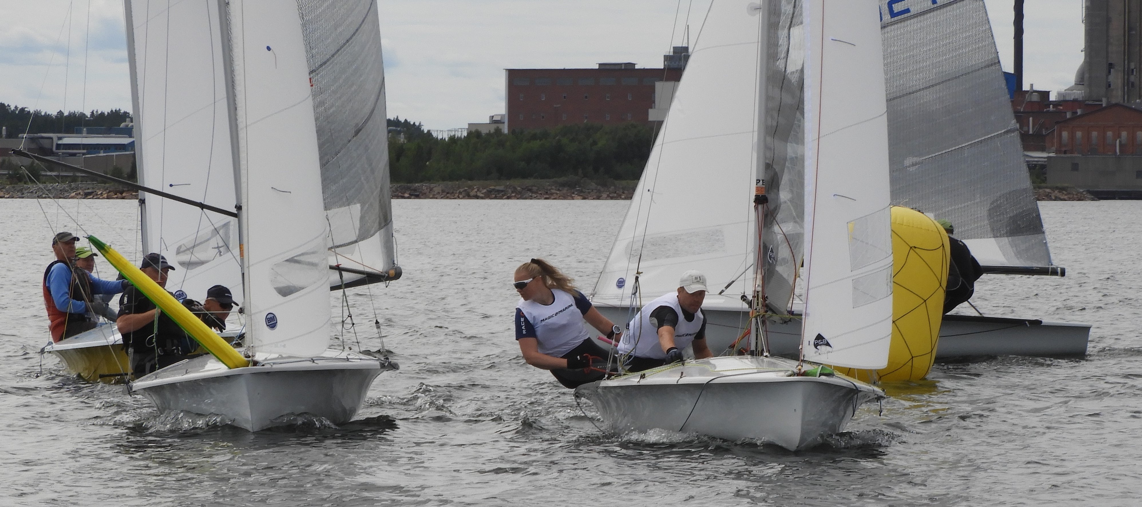 Nu gäller det att inte bli för stressad och nervös. En ren och fin start tack! Vi bestämmer oss för en tidig start med sikte på det håll varifrån vinden kom och hoppas på mer tryck där. Vi kommer iväg fint men oj va de lyfter uppe i lovart… Bara att segla på här där vi är och hoppas på ett skift lite längre upp i banan. Vi kommer upp som 3:a vid första rundningen med Peter och Martin flera båtar bakom oss. Det blir sedan en första avgörande undanvind där vi och Berg/Calvert gör ett bra vägval och rundar upp nära varandra till sista kryssen. Peter och Martin fortsatt en bit bakom. Inför sista undanvinden ligger vi tajt med Tomas Berg/Johan Calvert och vi gippar båda tidigt, Peter och Martin fortsätter utan gipp. Vi går bra mot Berg/Calvert men ser att Peter och Martin får en riktigt bra resa på sin sida. Vi gippar för att inte släppa dem helt och hamnar lite mitt i banan vilket ibland har resulterat i dåligt tryck och det känns lite stressande. Men vi lyckas nå bottenmärket först och kan gå i mål i den sista och avgörande seglingen som vinnare. Peter och Martin seglar upp sig ett par platser och blir 4:a i mål. Vi tror men vet inte säkert om det räcker men är så glada och stolta över att vi lyckades få till ett riktigt bra race när det behövdes som mest!